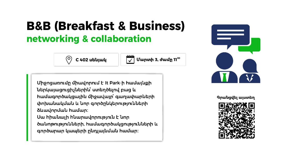 B&B (Breakfast & Business) հանդիպումը նախատեսված է համայնքի ներկայացուցիչների, ձեռներեցների և մասնագետների համար, ովքեր ցանկանում են ընդլայնել իրենց կապերի շրջանակը և քննարկել նոր գաղափարներ։